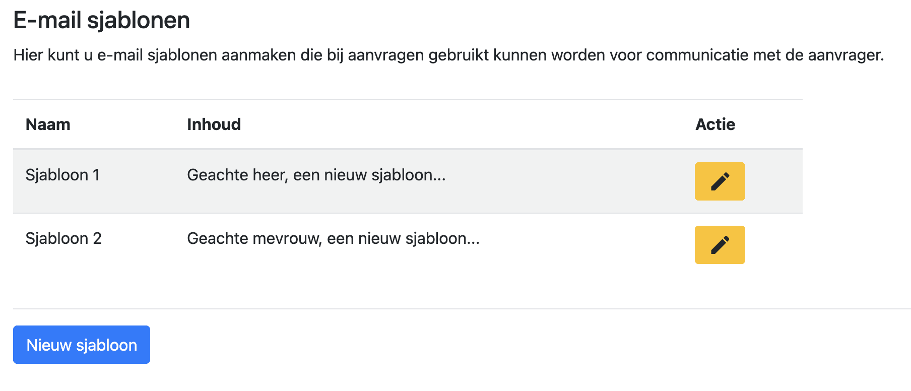 Om de communicatie eenduidig en snel te laten verlopen kunt u e-mail sjablonen aanmaken die gebruikt kunnen worden in uw reacties op aanvragen.